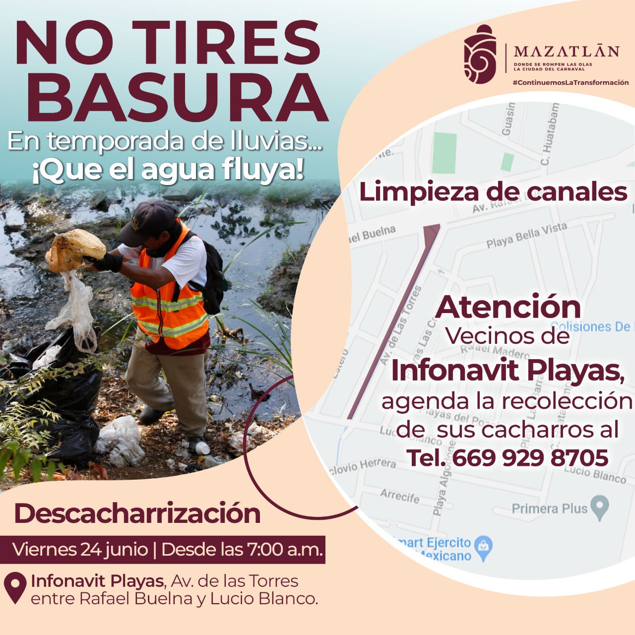 Gobierno Municipal, a través de la Dirección de Servicios Públicos ha programado la campaña “En temporada de lluvias, que el agua fluya”, el próximo viernes 24 de junio en el canal que pasa por la avenida Las Torres, desde Rafael Buelna hasta llegar a la vialidad Lucio Blanco, a partir de las 7 de la mañana.