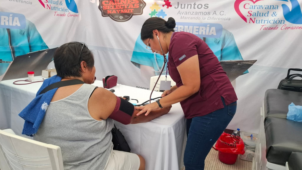 Instalada en el estacionamiento de Carnes Selectas Nayarit, ubicado en el Mercado Juárez de la colonia Benito Juárez, esta jornada de salud ofrece atención médica integral gratuita a la ciudadanía en un horario de 9:00 a.m. a 2:00 p.m., durante los días sábado12 y domingo 13 de julio.