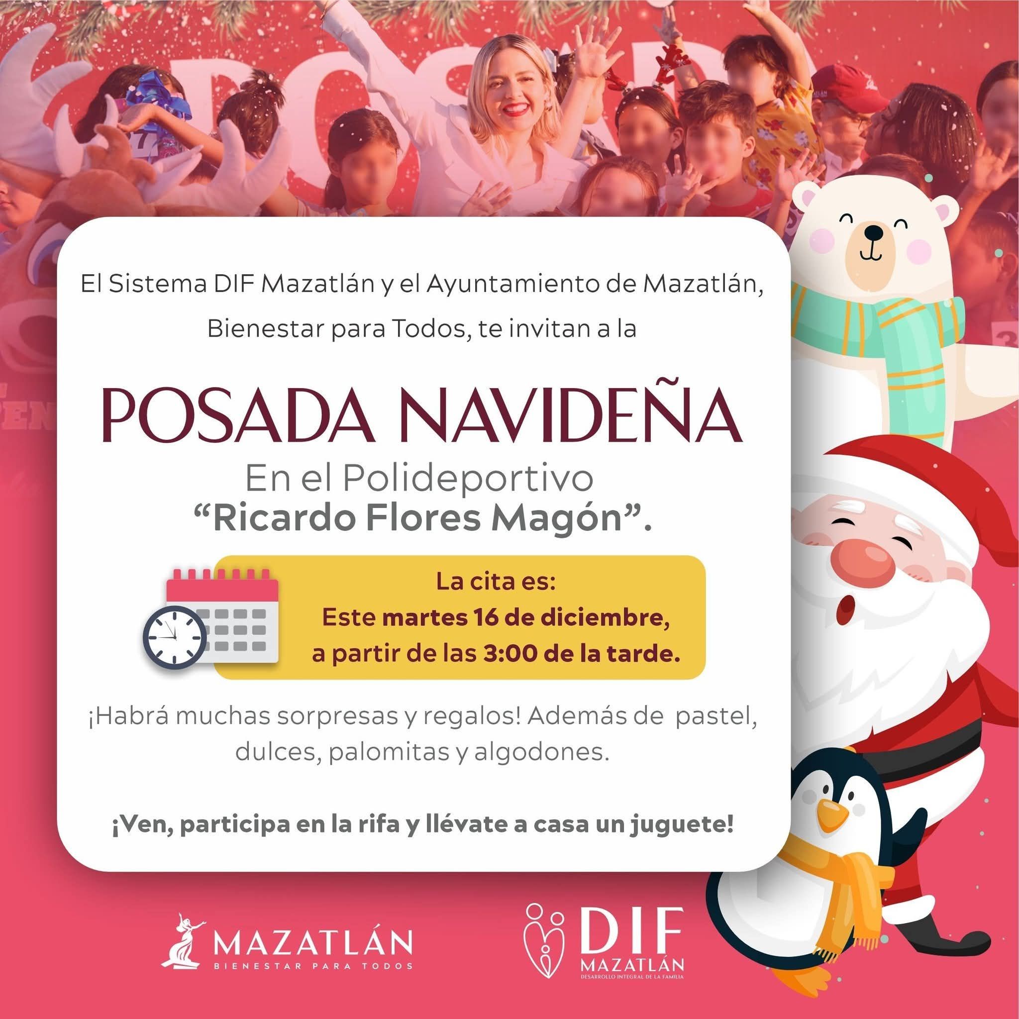 Mazatlán, Sinaloa, 15 de diciembre de 2025.- El Gobierno Municipal de Mazatlán, a través del Sistema DIF Mazatlán, invita a las familias mazatlecas a participar en la Gran Posada Navideña, que se llevará a cabo el día de mañana martes 16 de diciembre en la Unidad Deportiva Ricardo Flores Magón, ubicada en la colonia Flores Magón, a partir de las 15:00 horas.