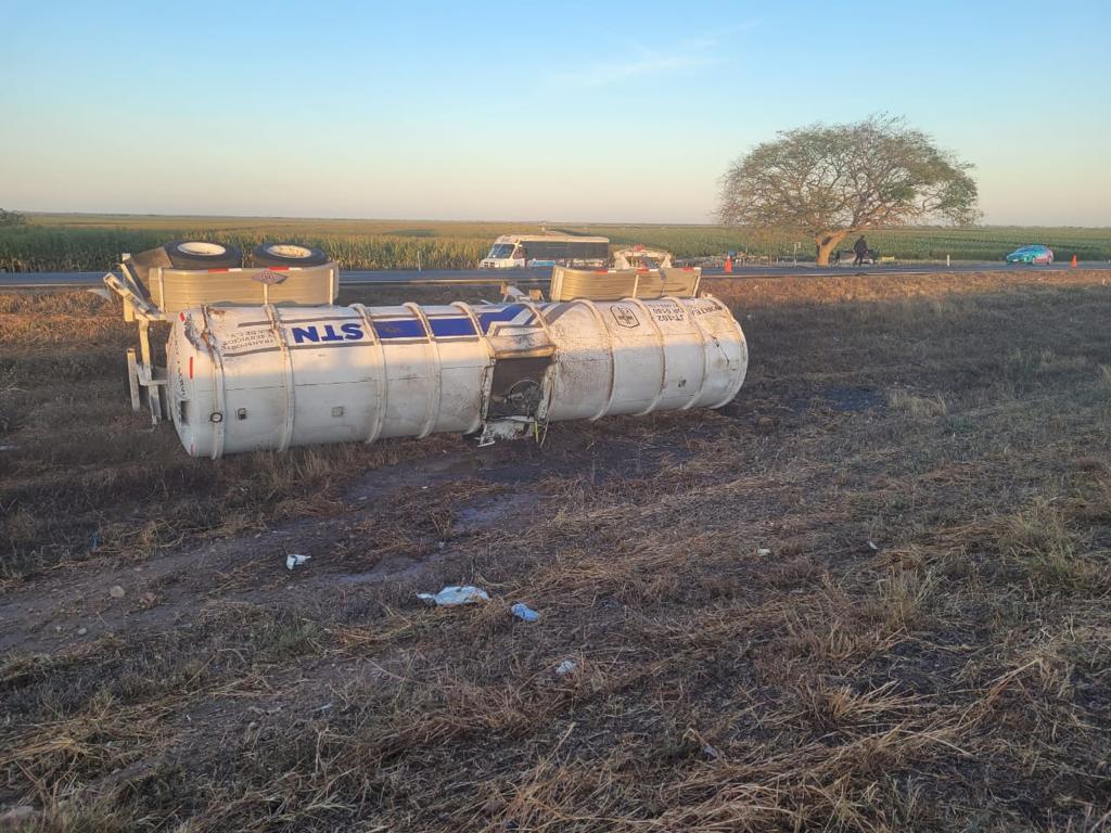 Elota, Sinaloa.- Un tractocamión con remolque tipo cisterna, en el cual transportaban hidrocarburo, sufrió un accidente de tránsito y esto generó derrame de combustible y el cierre de la rúa en ambos sentidos.