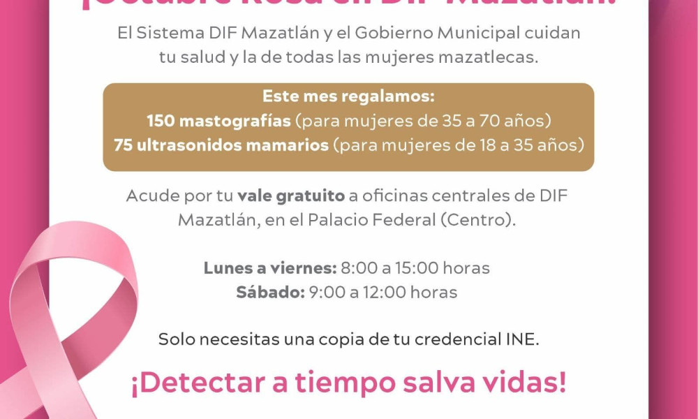 Te invitamos a acudir por tu vale gratuito para mastografía o ultrasonido mamario, a partir de este lunes en oficina central de DIF Mazatlán, ubicadas en...