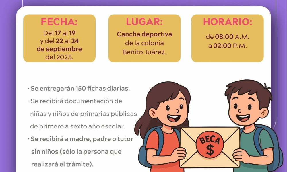 Del 17 al 19 y del 22 al 24 de septiembre, en la cancha deportiva de la colonia Benito Juárez, se recibirá documentación para becas PROBEC...
