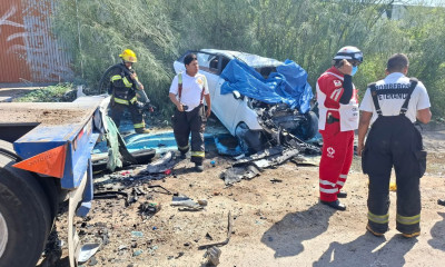 Se dijo que la conductora choco contra otra unidad de la marca NP300, lo cual, le provocó la volcadura Mazatlán, Sinaloa.- Elementos del cuerpo de Bomberos...