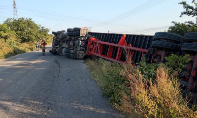 Elota, Sinaloa.- En el área verde de la parte central de la carretera de cuota y volcado a su izquierda, así terminó la marcha de un tráiler con doble remolque, el cual transportaba cerveza.